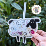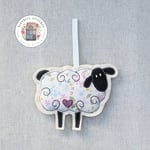 Each Sheep Hanger is handmade using cotton quilting fabric in cream with a pink, blue, green floral detail, lightly stuffed and sewn onto Cream wool felt backing, as shown in the photo.